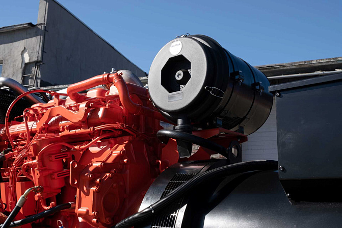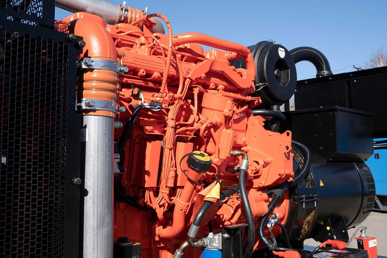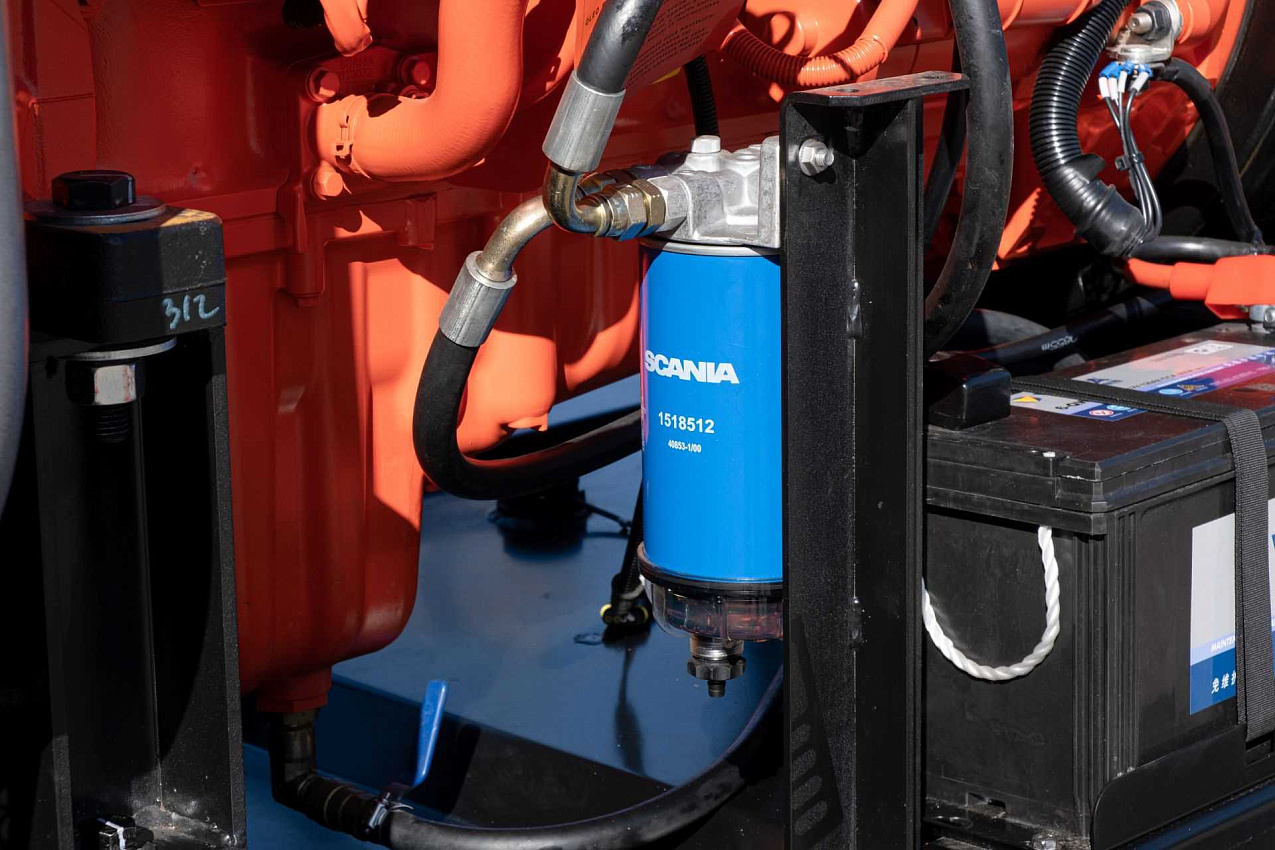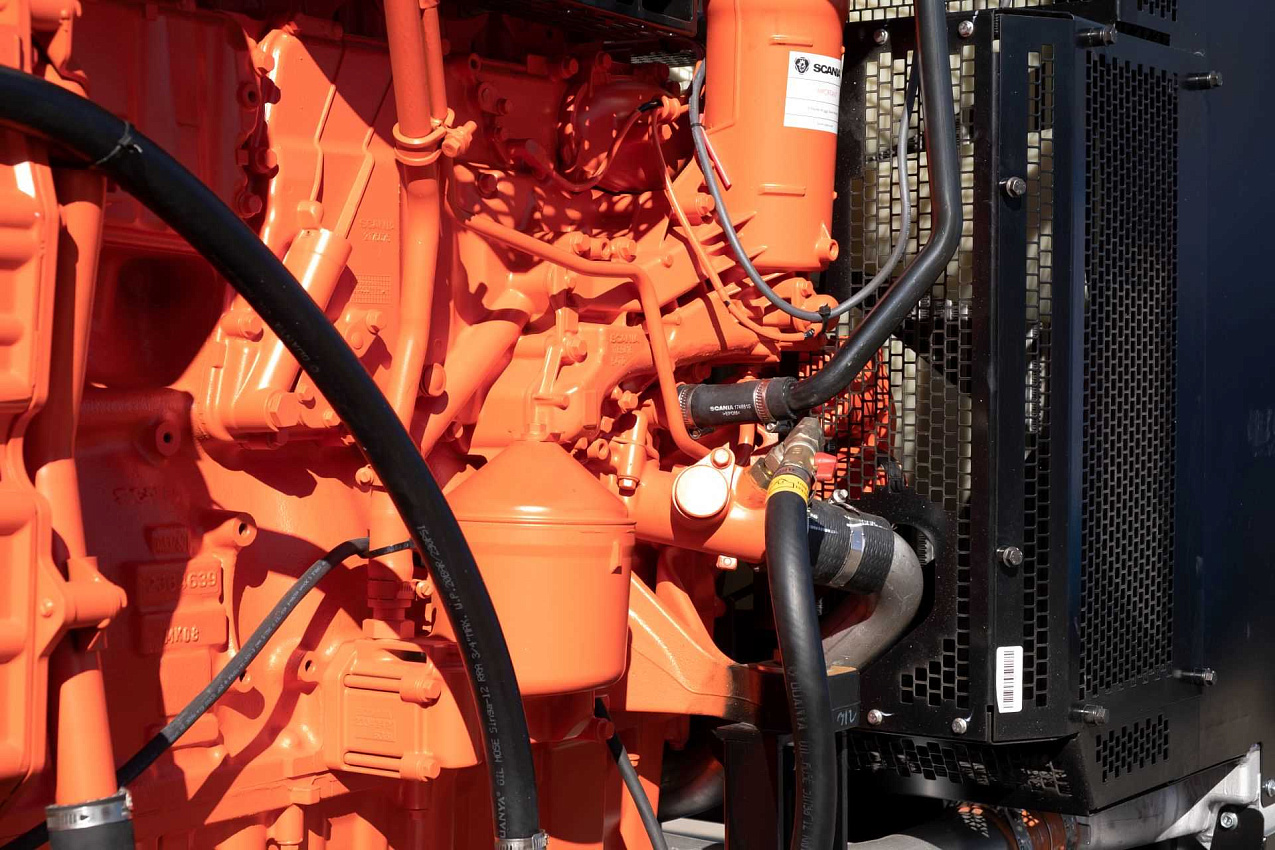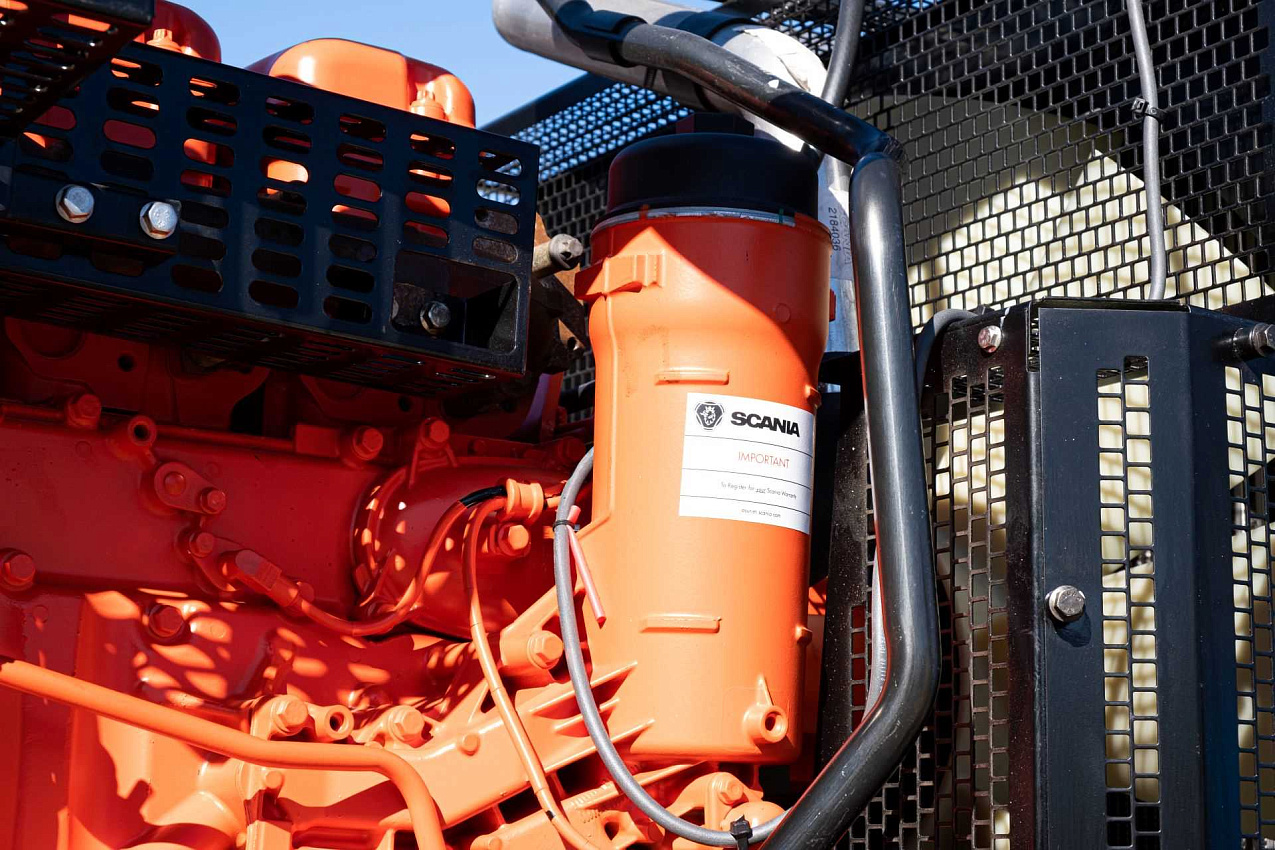 Дизельный генератор 264 кВт с двигателем Scania. В комплектацию входит - подогреватель охлаждающей жидкости, фильтр-сепаратор топливный, масляный фильтр, автомат защиты генератора, устройство подзарядки аккумуляторной батареи, датчик уровня топлива, насос для откачки масла из картера двигателя, аккумуляторная батарея, дренаж топливного бака. Панель управления на базе контроллера ComAp AMF25.